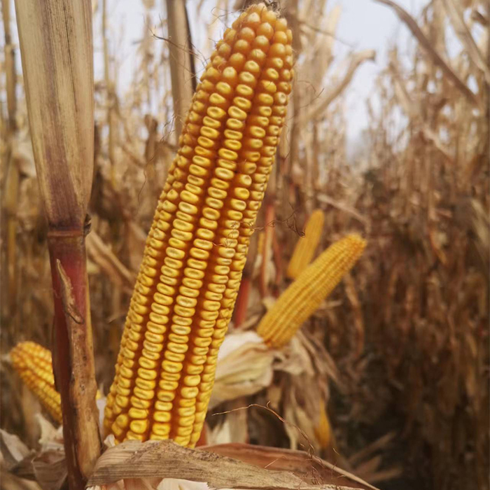 特征特性:普通玉米品種。在適應(yīng)區(qū)出苗至成熟生育日數(shù)為122天左右,需≥10℃活動(dòng)積溫2500℃左右。該品種幼苗期第一葉鞘紫色,葉片深綠色,莖綠色。株高285厘米,穗位高112厘米,成株可見16片葉。果穗圓錐型,穗軸紅色,穗長(zhǎng)20.9厘米,穗粗4.9厘米,穗行數(shù)14~16行,籽粒馬齒型、黃色,百粒重40.6克。兩年品質(zhì)分析結(jié)果:容重759~767克/升,粗淀粉72.85%~75.35%,粗蛋白11.52%~11.54%,粗脂肪3.17%~3.78%。三年抗病接種鑒定結(jié)果:中感至感(5+~7)大斑病,絲黑穗病發(fā)病率11.1%~23.8%,莖腐病發(fā)病率2.3%~5.6%。